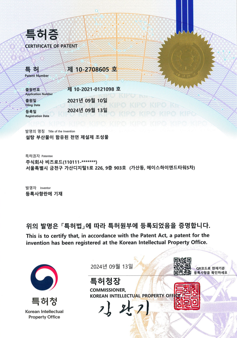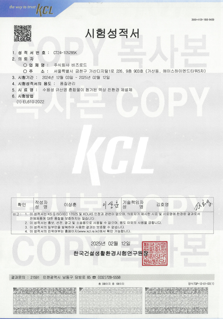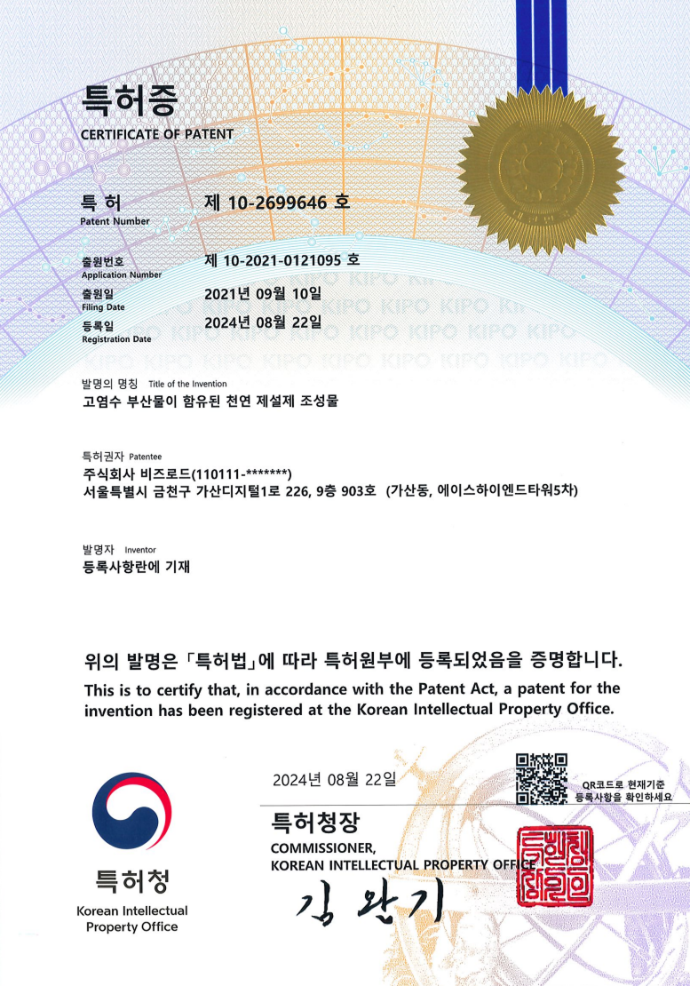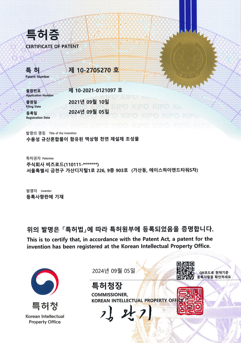 비즈로드는 친환경 재설제 분야의 연구개발 성과를 바탕으로 다양한 특허를 출원하고 등록하여 기술적 우위를 확보하고 있습니다. 고염수 부산물, 수용성 규산혼합물, 설탕 부산물 등을 활용한 천연 제설제 조성물 개발을 통해 특허권을 보유하고 있으며, 국내외 인증을 획득하여 제품의 품질과 안전성을 검증받았습니다. 친환경 제설제 시험성적서 등 글로벌 표준 인증을 통해 해외 시장 진출의 기반을 마련하고 있으며, 지속적인 연구개발과 지적재산권 확보를 통해 기술 혁신 기업으로서의 위상을 강화하고 있습니다.